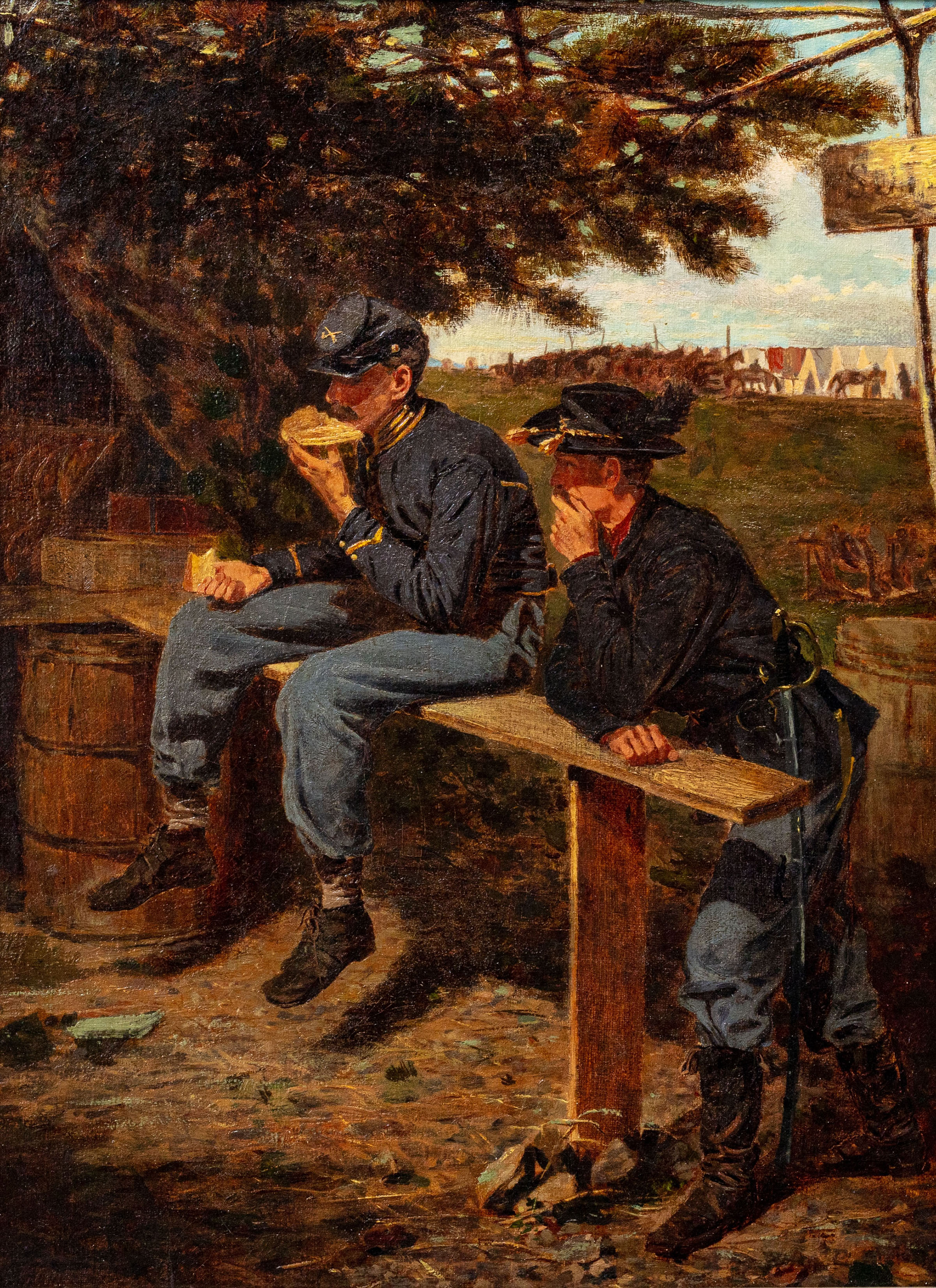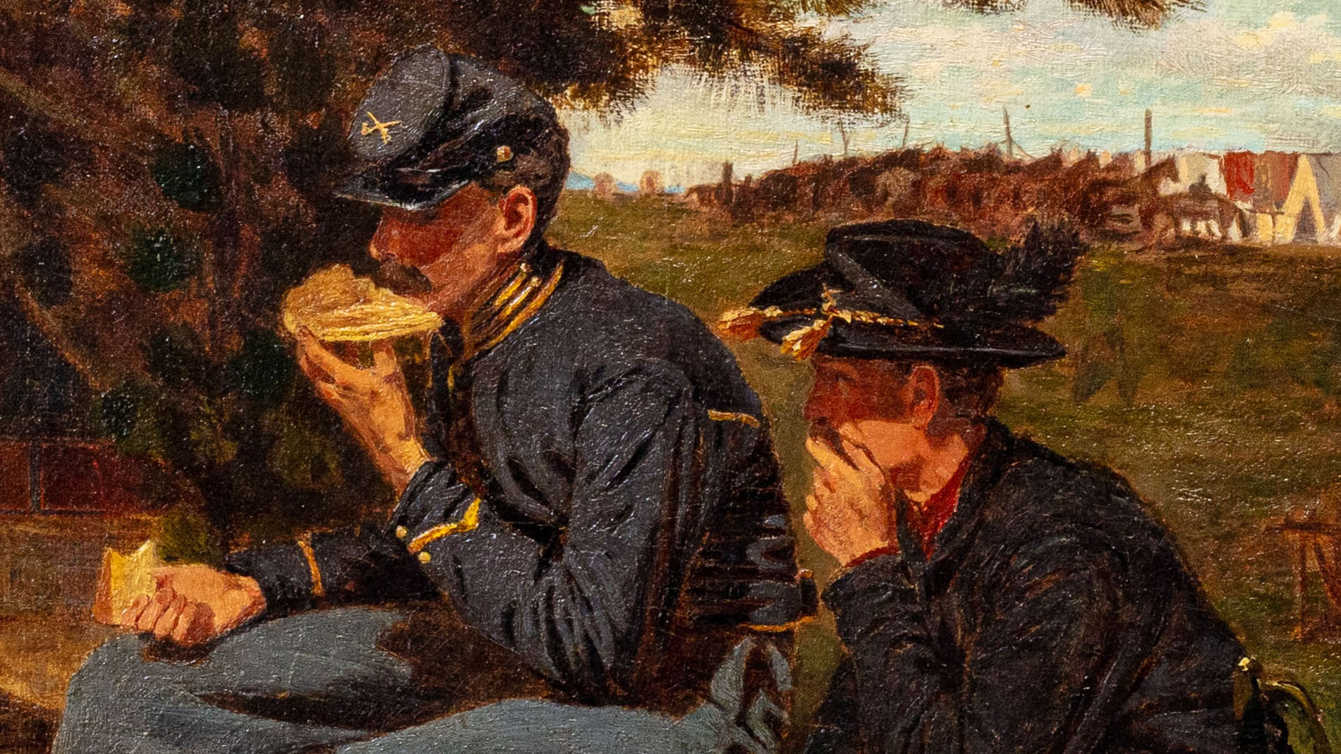 Harper's Weekly reproduced Homer's war art as wood engravings. The Sutler's Tent is related to a Thanksgiving-themed illustration that ran in November 1862. That means the engraving came before the painting, dated 1863. The horizontal-format print shows many more figures than the painting and clearly shows the tent. (The signage confirms that the soldier at left center is eating half a pie, freehand.) The printed image was likely based on a drawing now at the National Gallery of Art, Sutler's Tent, Third Pennsylvania Cavalry. Homer evidently felt the tight cropping of the painting made a stronger composition.