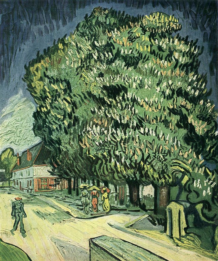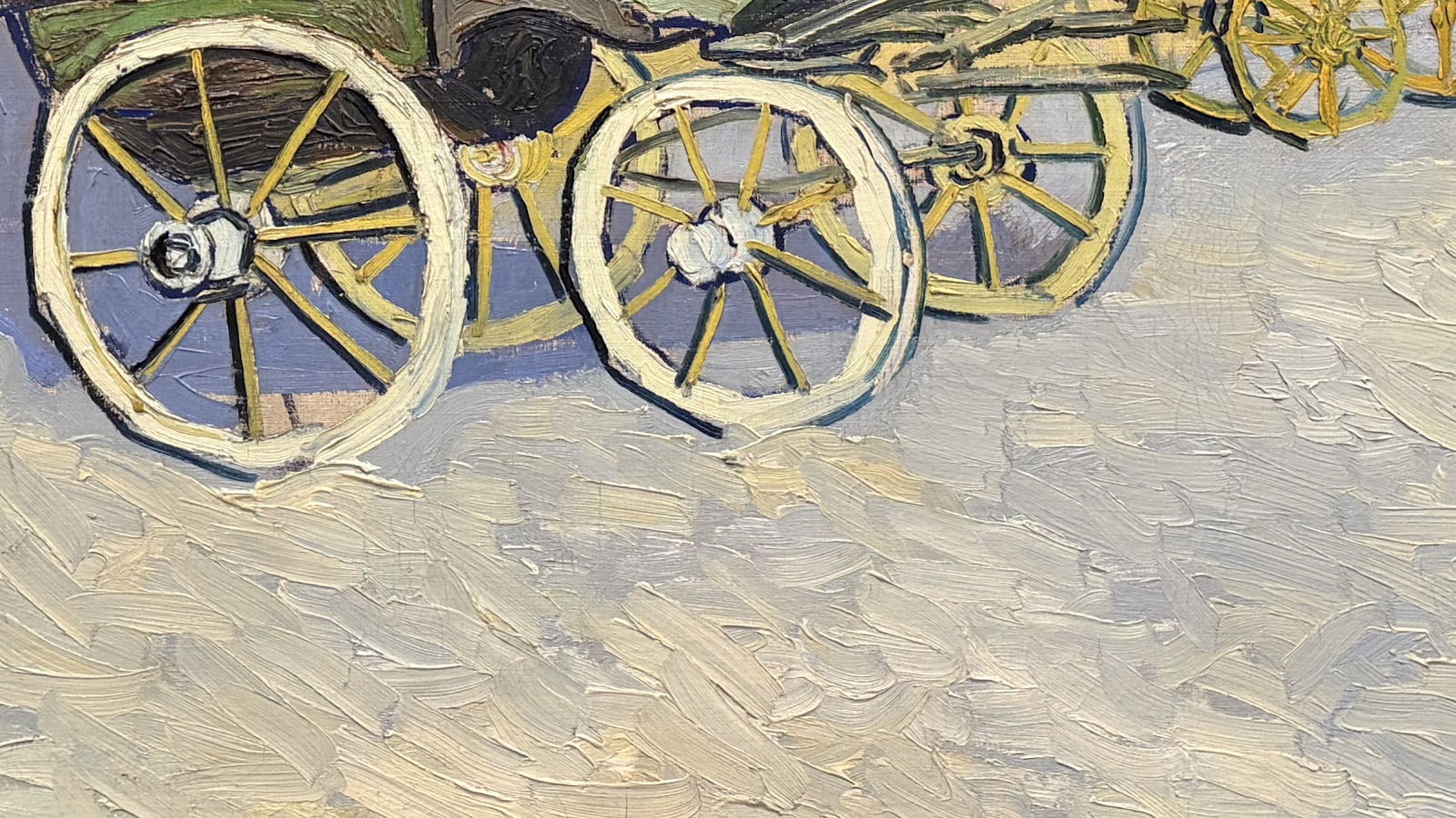 The painting's most daring feature is the brushy blue-white foreground. Half of a van Gogh painting is a Robert Ryman! The artist must have been thinking of Japanese prints. The stagecoach's lilac shadow foregrounds whiter-than-white wheels with black-and-ochre spokes.