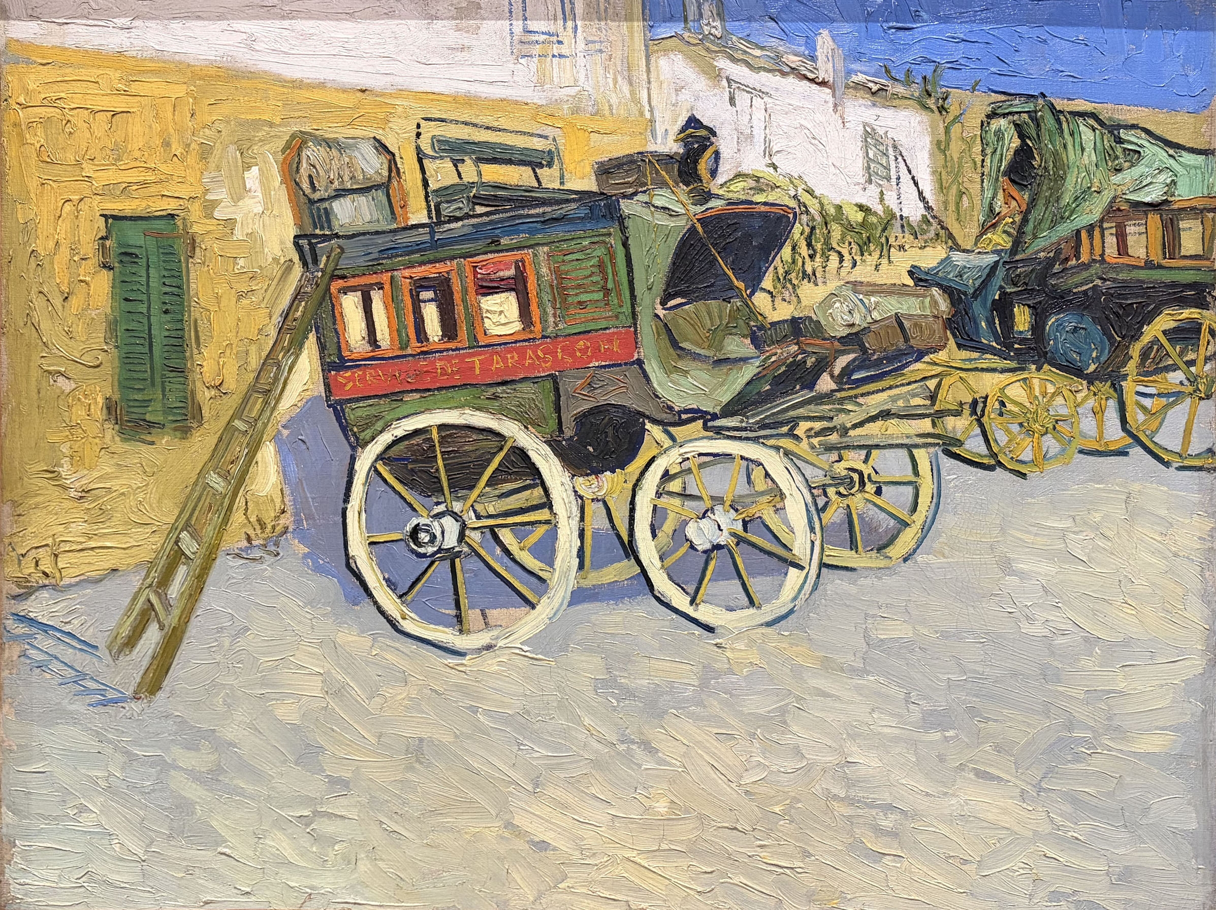 Tarascon Stagecoach had no prior connection to Los Angeles. It's an unusual subject: Americans associate stagecoaches with the Old West, not the south of France. Van Gogh took the idea from Alphonse Daudet's 1872 novel, Tartarin de Tarascon, a boisterous satire in the spirit of Don Quixote. One section is narrated by a stagecoach, recounting its existence from a working conveyance in Tarascon, France, to being torn up for firewood in North Africa.