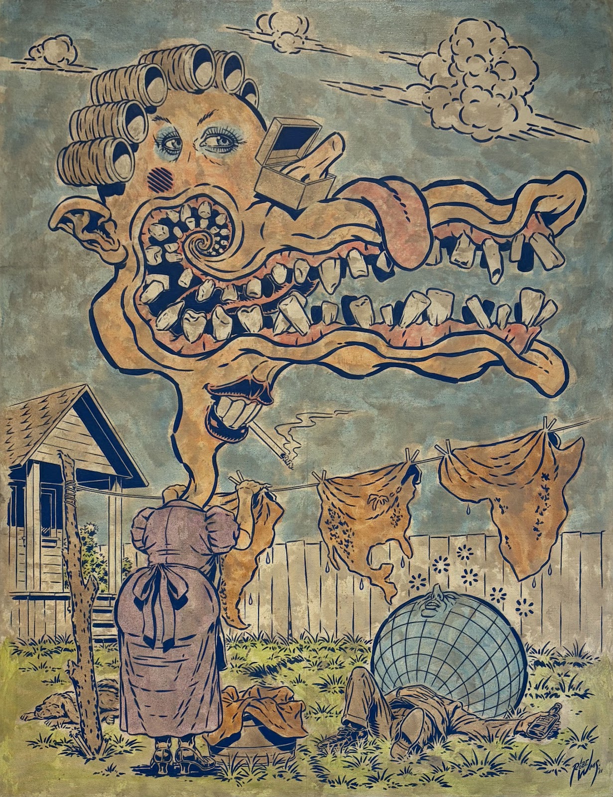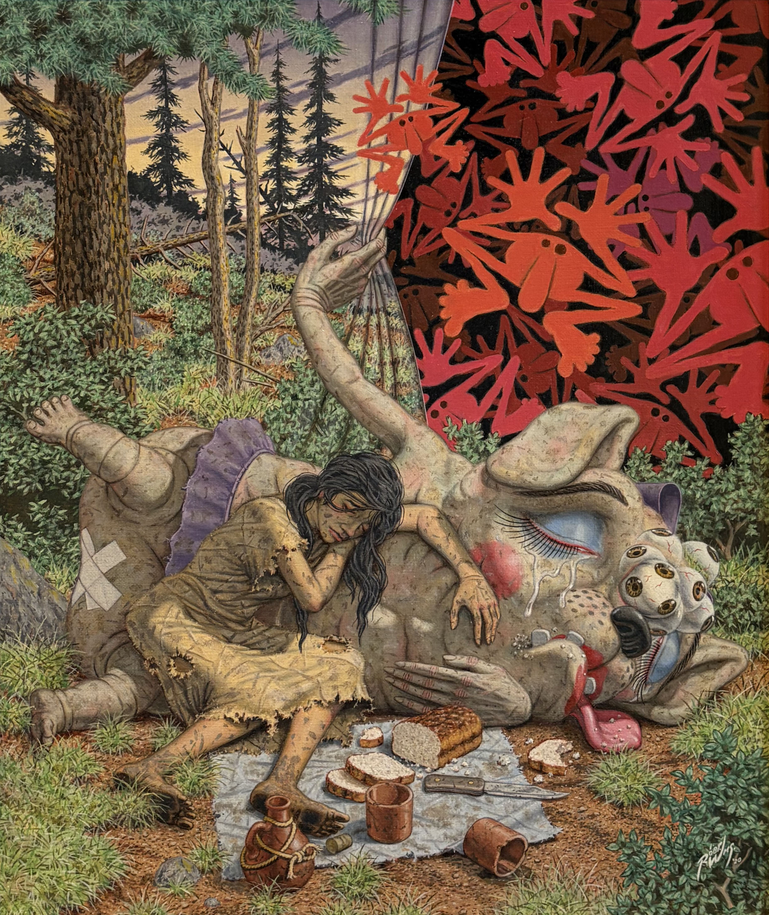 A standout in the latest Istanbul Biennial and the Hammer’s 2025 edition of “Made in L.A.,” Ali Eyal’s multidisciplinary practice meditates on the violence he and his family endured at the hands of the U.S. military during his upbringing in Baghdad in the ’90s and 2000s. Equally important to him is the legacy of that violence, which he calls “the after war.” The grotesque, cartoonish figures in his paintings render the absurdity and distortion of state violence more sharply than realism ever could.
