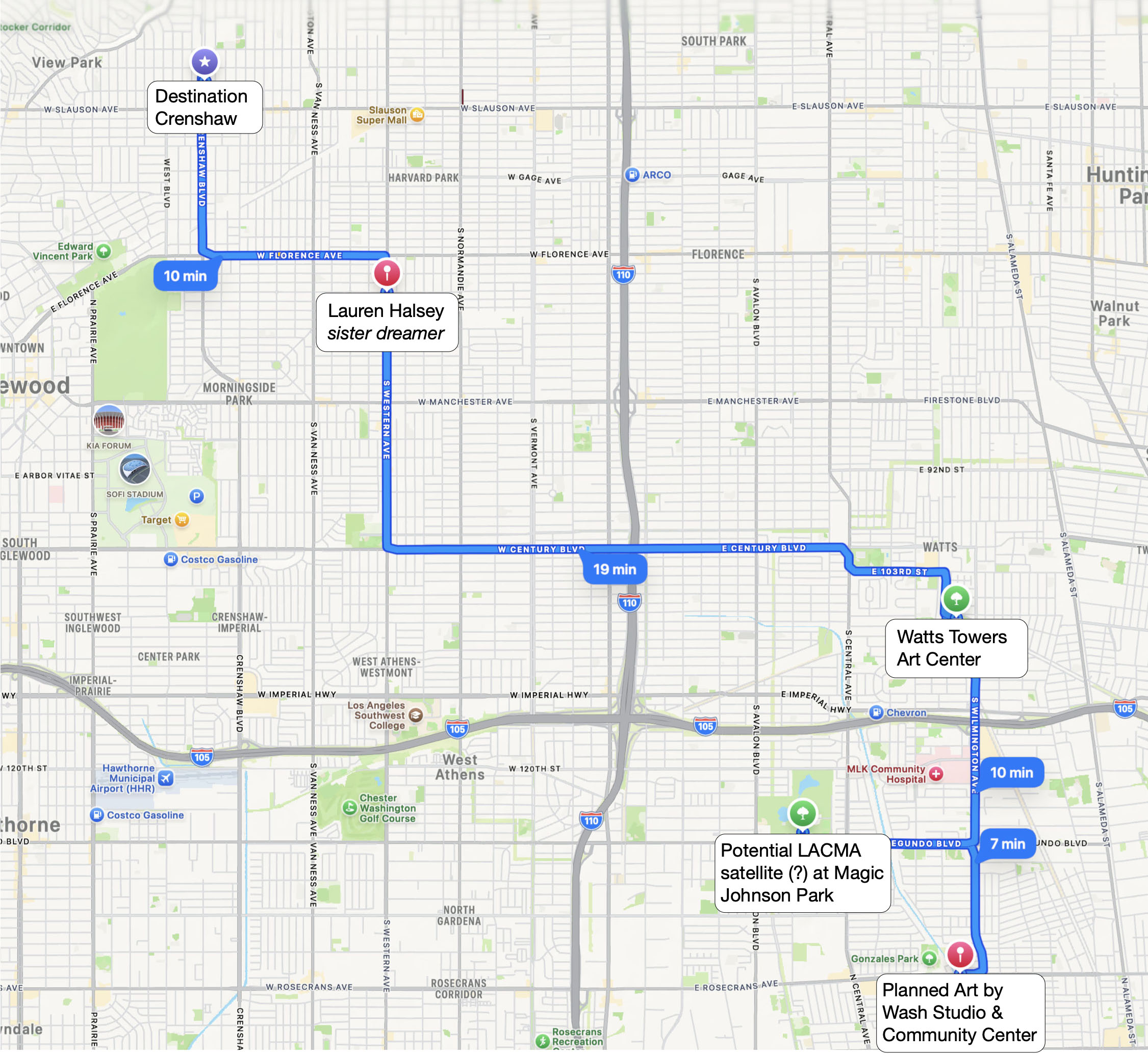 sister dreamer is about 2.7 miles from "outdoor museum" Destination Crenshaw (with work by Melvin Edwards, Maren Hassinger, Alison Saar, and Kehinde Wiley) and about a 20 minute drive from Simon Rodia's Watts Towers and the adjacent art center. It seems that LACMA is still considering a satellite location in Magic Johnson Park, not too far away; and Mr. Wash has plans to convert his Compton studio into an Art By Wash Studio & Community Center.