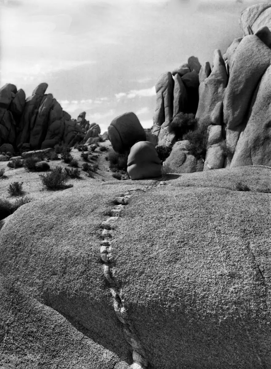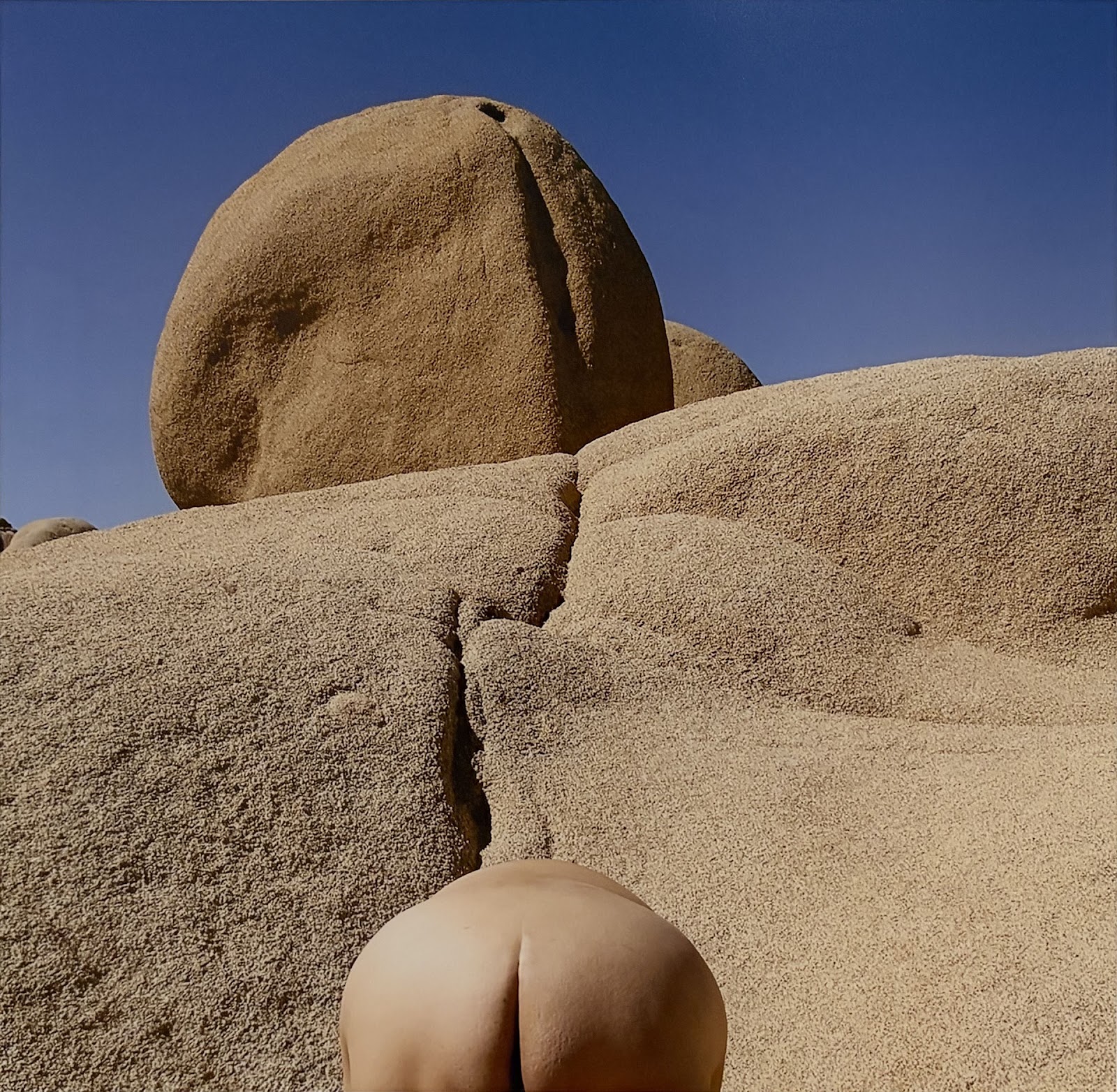 The "Grounded" series, shot in Joshua Tree National Park in 2006–2007, trades in visual puns that veer into the metaphysical. In an untitled color print, the artist moons the camera, mimicking a geologic butt crack. In #106, Aguilar's body merges with the landscape, like some kind of evolutionary camouflage.