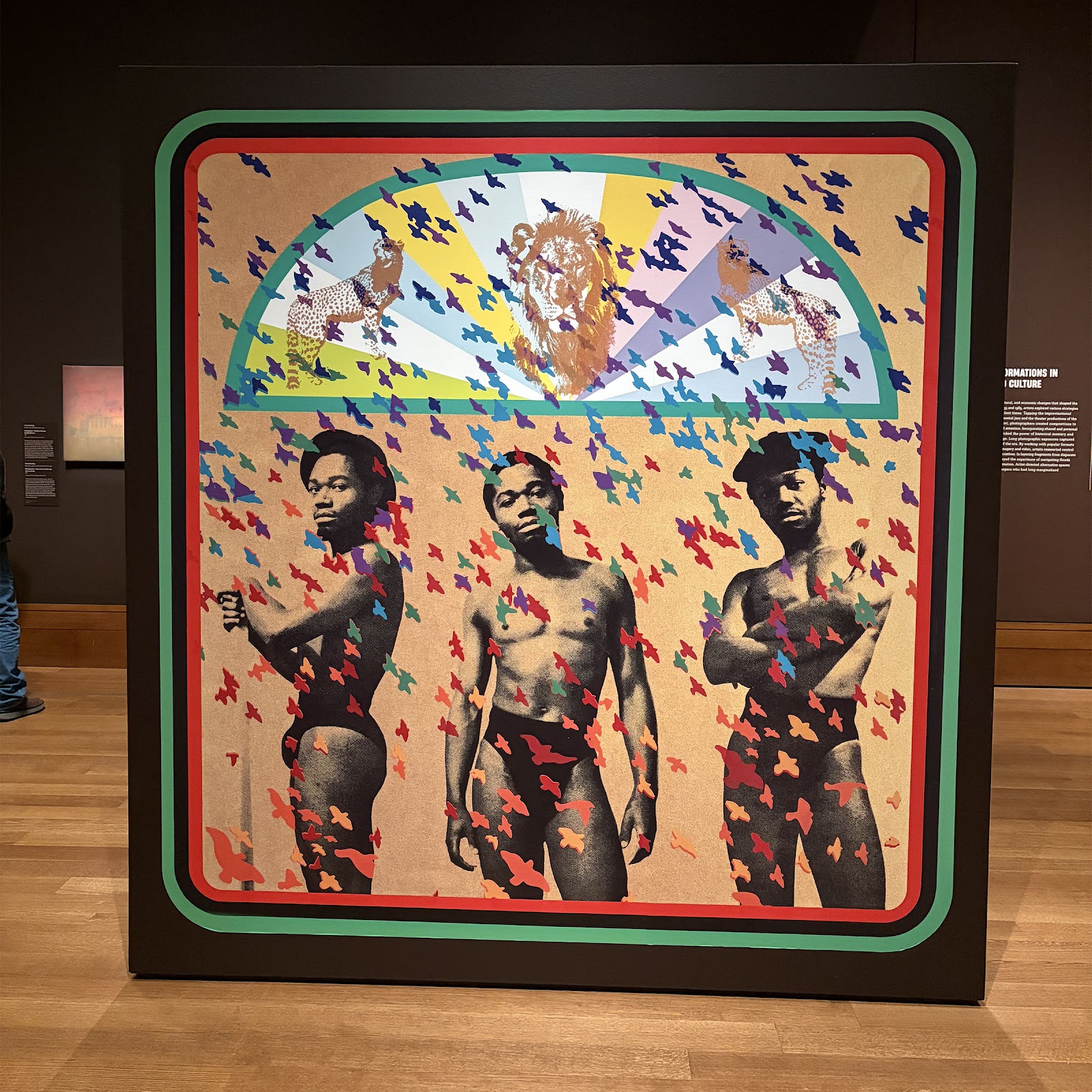 Kwame Brathwaite popularized the "Black is Beautiful" catchphrase with images of elegant Black women, upending the editorial standards of white fashion. A male counterpart is Ben Jones' Stand/Funk Elegance, a 1975 screen print. Pan-African colors frame three images of dancer Larry Sanders in a soul-era paragone.