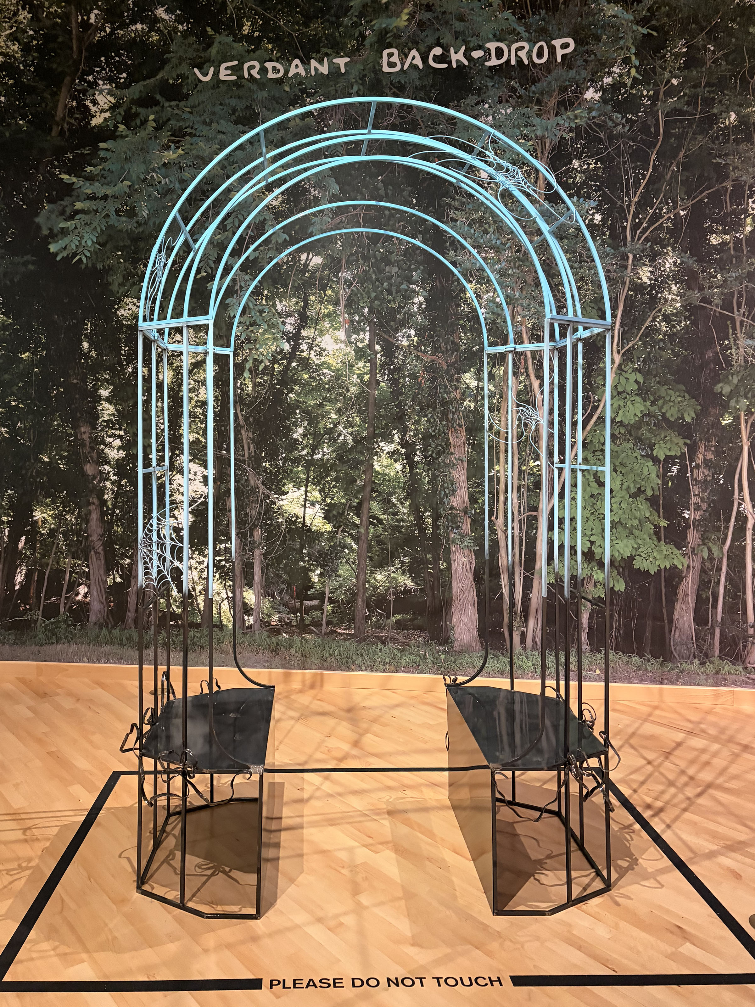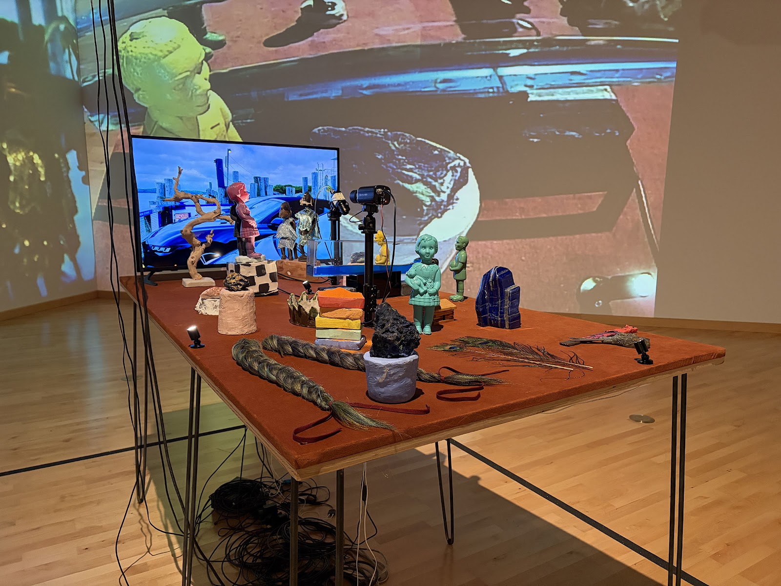Cauleen Smith's video installation is an immersive two-channel video incorporating video from Sag Harbor and live feeds from objects on a table. The mineral specimens include the blue stone azurite, and the braids were inspired by the hairstyle of the architect in a photo, lounging on the beach. For Meredith Azurest was a place where "the deep blue sky of hope meets the space of comfort."